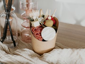 A beautiful single-serving graze, perfect for cocktail hours or events. Each cup includes a curates selection of cheese, salami, fruit, and accompaniments - a light appetizer.