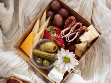 A single-serving box featuring a variety of artisanal cheese, salami, seasonal fruit, pickles, olives and four crackers tucked inside.